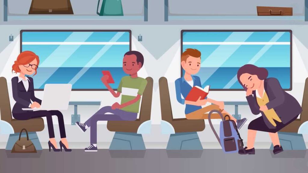 L’immagine mostra quattro persone su un treno, ognuna delle quali fa qualcosa di diverso.
