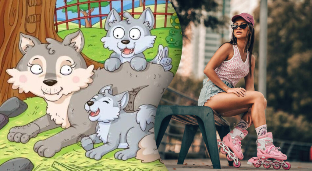Nella foto vediamo una lupa con due cuccioli. A prima vista, nella foto non sembrano esserci pattini a rotelle, ma non fidatevi della prima impressione.