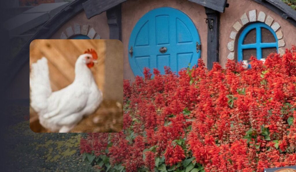 La gallina si vede nella parte sinistra della foto, ben nascosta tra i fiori rossi all’ingresso della cabina.