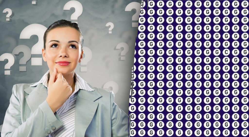Nell’immagine vediamo la lettera G in un gran numero di cerchi, disposti in colonne e righe. A prima vista può sembrare che nell’immagine non ci siano altre lettere oltre a queste, ma in realtà non è così.